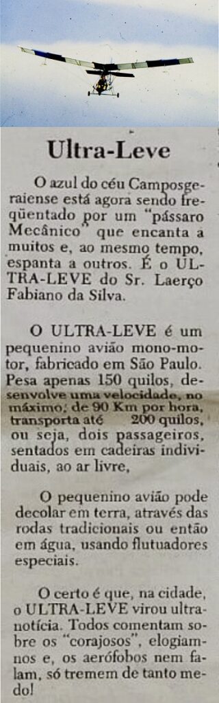 O certo é que, na cidade, ULTRA-LEVE virou ultra notícia. Todos comentam sobre os “corajosos”, elogiam-nos e, os aerófobos nem falam, só tremem de tanto medo!”